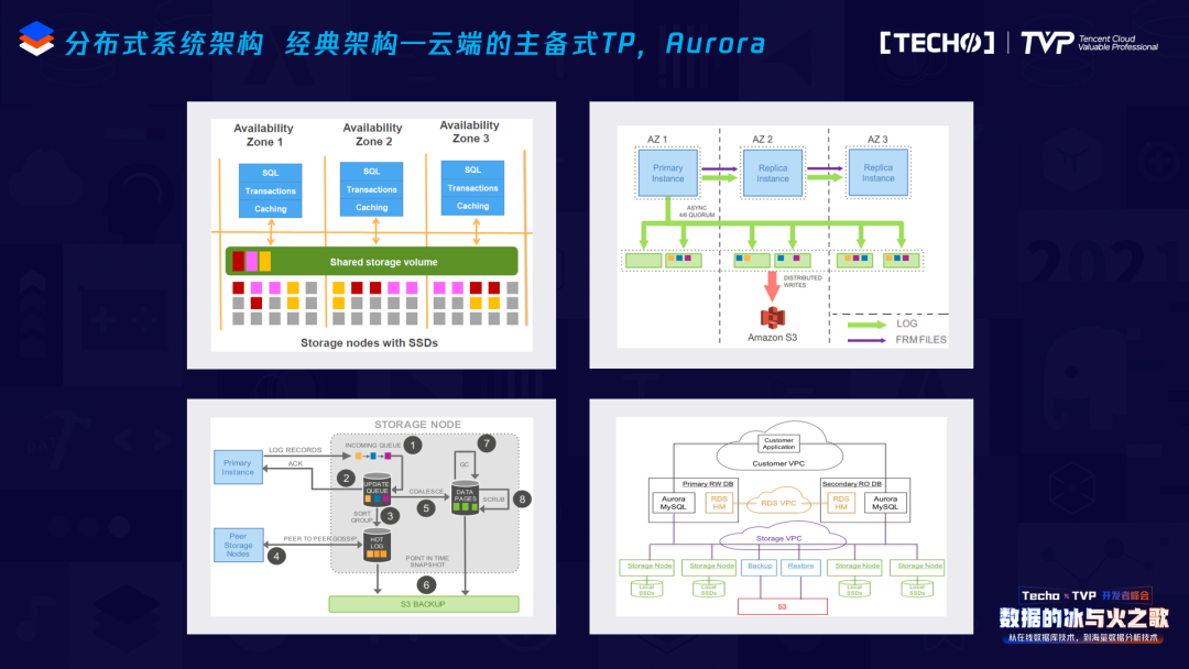 时光推移到七八年前,亚马逊的Aurora系统诞生,它本质上还是主从架构、一主多备式的,进步的地方在于做成了一个云上的存算分离的系统。所以1.5时代的产品,典型的代表是类似于早期的主从+Aurora这种架构,这是一个过渡时代。再往后我们会进入到真正的分布式数据库时代,它典型的标志是什么?是多写,在每一个节点上都平等地对待,可以在每一个节点上写,这里面的技术就又有多种,有的是伪的分布式,其把事务的所有写操作集中在单一的节点上去做,真的分布式是利用分布式并发访问控制算法,在每一个节点上去做数据一致性的保障。