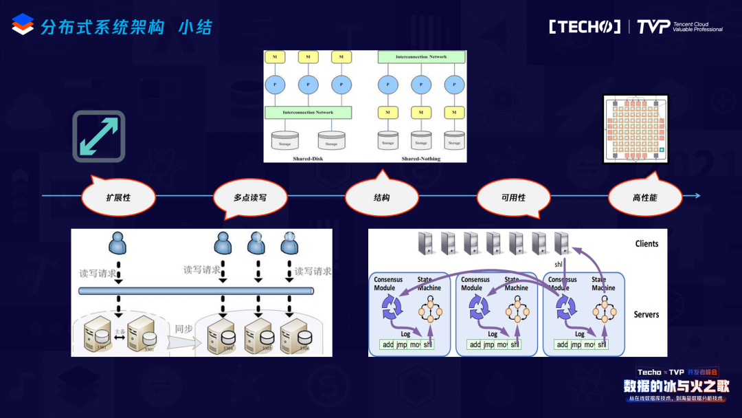数据库基本架构的演进就是经历了这么一个过程,总结一下,反过来从技术角度来看究竟是什么因素在推动分布式数据库系统的演进。其实数据库系统有一些内在的、本质性的需求在推动它,我们以前说数据库系统里面有“三高一易”,高可靠、高可用、高性能、易用性等等,这些基础因素在推动着分布式技术不断地向前发展,到后来演化成分布式数据库系统的时候,对于水平扩展的要求提上日程,所以我的第一个总结是针对扩展,不仅是垂直扩展,而且要水平扩展,所以对于扩展性下的多读多写场景,使得分布式数据库的结构变成纯粹的每一个节点都是对等的结构。在分布系统里要讲究可用性,包括数据层面的可用如共识协议下的数据多副本机制、也包括整个系统功能层面的可用。如果以较少的投入获得高的性能,那就可以对外支撑更多的业务,成本就会更低。所以对于数据库内在原生的要求从单机数据库系统到分布式数据库系统一直没有发生过变化。这是我分享的第一部分。