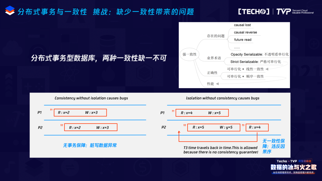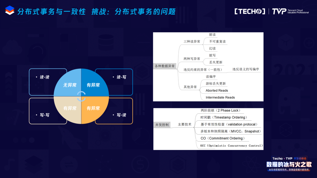 而根据我们的研究,发现数据异常有无数个,无穷尽的东西,怎么去认知?这又形成新的挑战。TDSQL在做的一项工作事就是对数据异常归类,把数据异常分成有限的若干种,对它进行认知,基于这样的认知就可以定义什么叫隔离级别、什么叫一致性,怎么去影响、看待现有所有的并发访问控制算法,怎么和分布式一致性去结合,这都是TDSQL在研的一些基础技术,也是刚才谈到的一致性技术里面的基础内容。