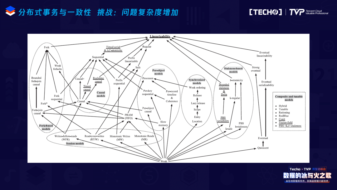 不只是上面提及的问题,我们面对的问题更为复杂。例如,如下这张图概况了各种分布式一致性的概念,很复杂,这里面大约有近60种分布式一致性,光把这幅图弄清楚、把每一种一致性弄清楚,已经不容易了,再和事务的ACID结合,难度就会更大。