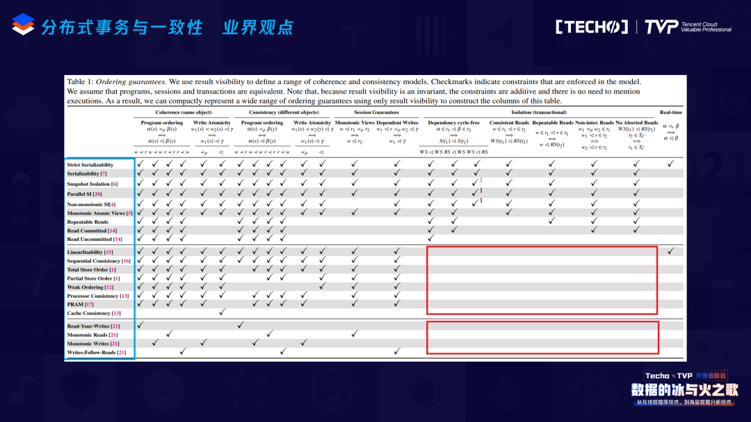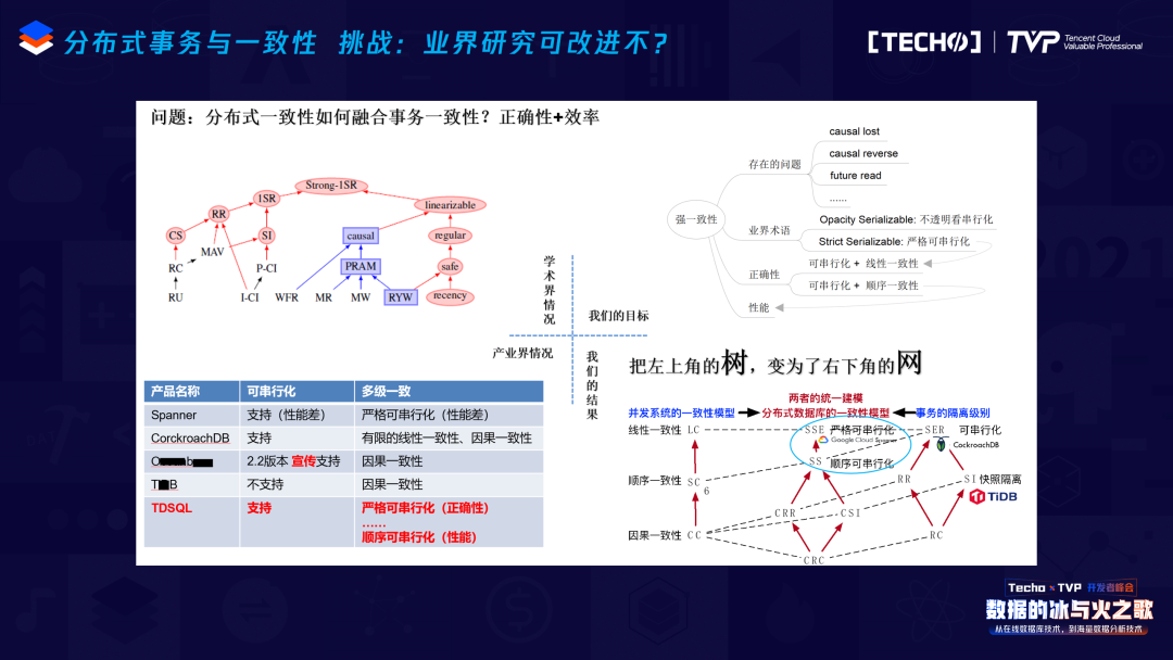 业界对于分布式事务的一致性,是有研究的。如下图,我大概解释一下这幅图的内容:左上角事务一致性,左下角分布式一致性,右上角有个隔离级别下的事务一致性问题,这是数据库里要处理的事情,但偏偏就在该图这个红色方框,分布式一致性和事务处理里面结合的这些地方目前为止没有相关的理论和技术来支撑,而这些也正是TDSQL在做分布式数据库系统当中致力于解决的问题。对比业界谷歌的Spanner,Spanner做到了真的强一致,这是目前我看到的唯一的强一致系统,唯二是TDSQL。Spanner做到了线性一致加ACID数据一致性的融合,业界实际上早有这个概念叫做严格可串行化,它能在全局层面保证分布式系统下数据的一致性,这才是真的强一致(请注意,这里强调全局,即从任何一个节点看去读取数据,大家都能读到一样的结果,不可能不同节点获得不同的观察结果)。