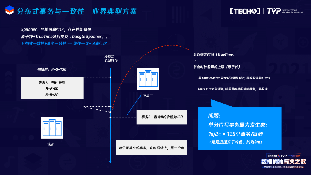 但是如果对Spanner做一个测试或者理论推导,会发现Spanner系统的事务处理性能非常差。Spanner能用到什么地方?就是用到非实时性广告系统数据的处理上面,但是大家听说过Spanner用到过金融系统里面吗?没有,此种背景下,就对TDSQL构成新挑战了,因为TDSQL要用到金融系统业务里面,我们既要保证正确性,又要保证性能。