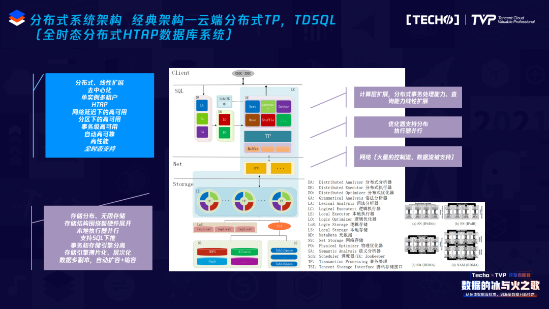 所以分布式数据库包含了比较多的内容:事务处理数据量的存储层面、计算层面等方面的问题,基于这些需求,我们展开了基础研究,做了TDSQL的HTAC系统,里面包含多种多样内容。这是我们系统的基础架构图,它看起来像一个单机系统,但是里面会有很多小的细节,可以看出其是一个分布式系统。