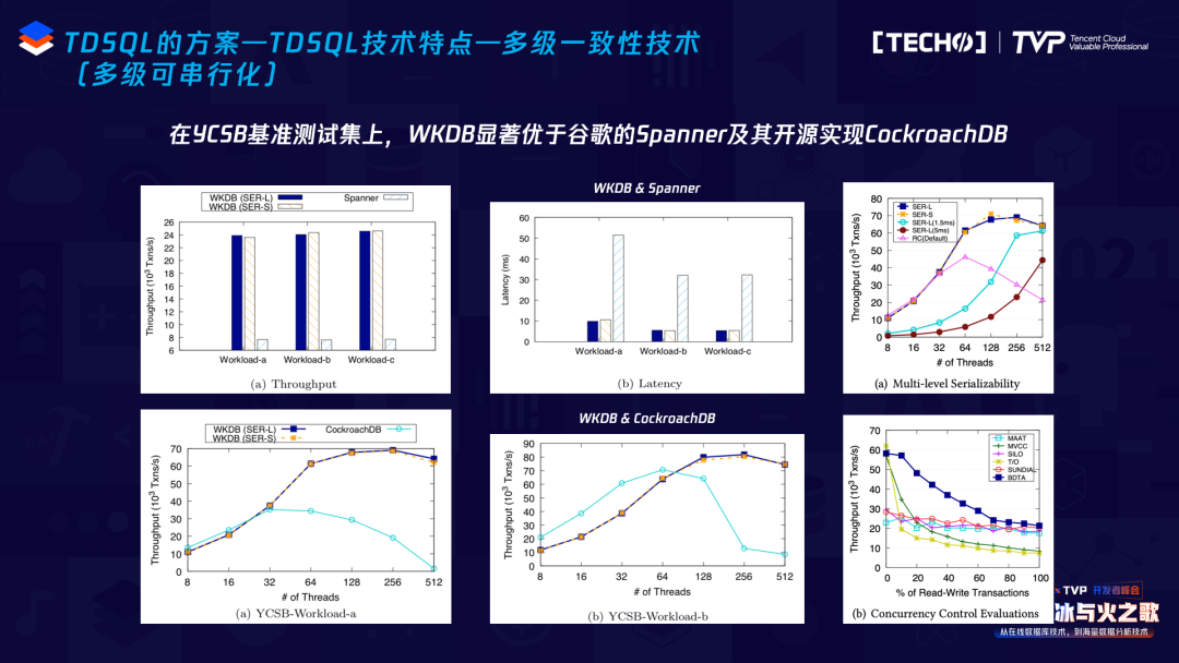 基于刚才的技术,我们研发出了多级一致性技术,即多种级别的可串行化技术,使得在分布式系统下,可串行化又可以分为多种级别。我们在谷歌云上买了Spanner服务,对比了Spanner,在GreenPlum上实现了多级一致性技术,又在MIT开源的一个系统上对比了多种并发访问控制算法,实验结果表明,TDSQL的性能都更好(该技术在2020年的DTCC上做过公开分享)。