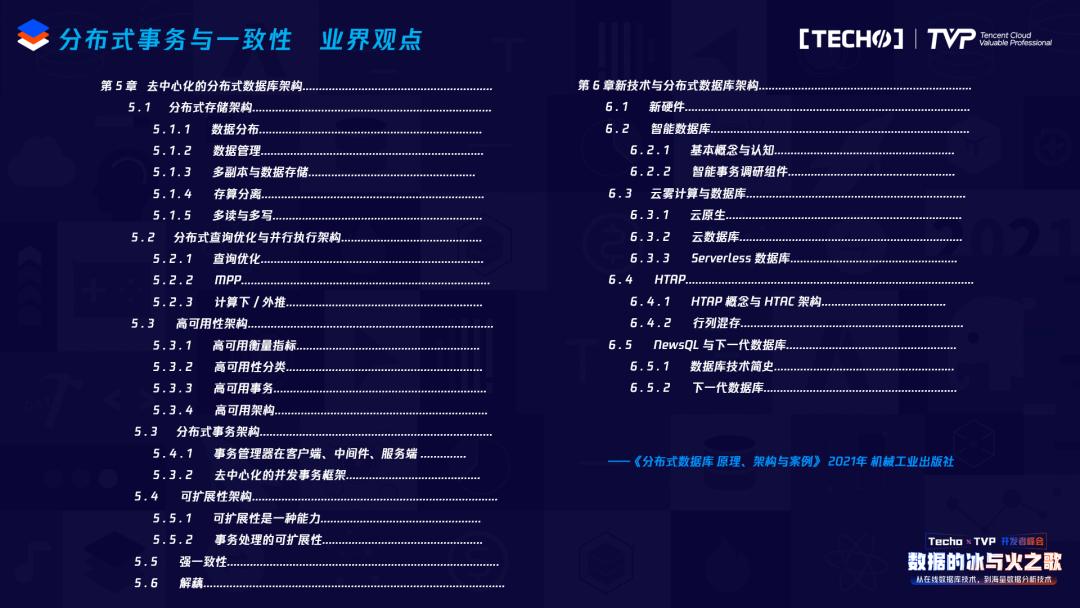 从外面的来看,新硬件、智能数据库、云计算,这些是计算对于数据库系统的要求;HTAP,还有下一代所谓的New SQL,数据库也在不断地演进,此过程中还会产生一些新的技术和内容。所以做分布式数据库,大部分就是基于单机数据库系统,再做一些和分布式相关的事。分布式相关的事情大概是我前面提到的那些主流技术,这张目录结构把没有包括的基本核心内容都包含了。