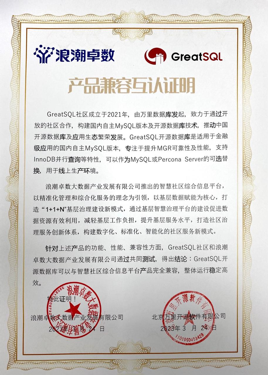 GreatSQL 开源数据库 & 浪潮桌数智慧社区综合信息平台产品兼容性互认证;