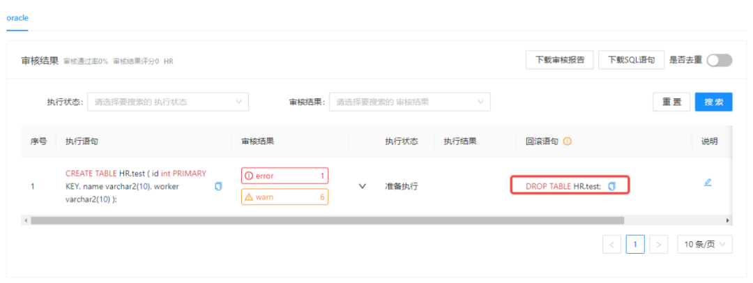 当用户通过平台对 Oracle 数据源进行 SQL 上线操作时,如果工单上线失败,可能会导致工单内的 SQL 只执行部分而未执行其他部分。对于已经执行的 SQL,用户可能不知道如何回退操作。为此,SQLE 提供了回滚语句提示,以帮助用户回退已经执行的操作,确保数据的一致性和完整性。以下是 Oracle 数据源下的回滚语句提示效果: