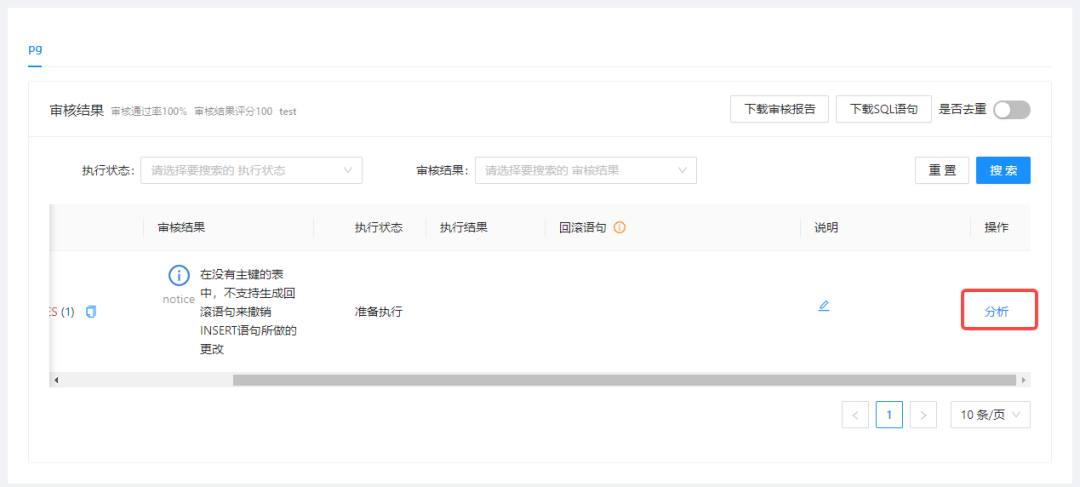 用户点击审核结果栏中的分析按钮;