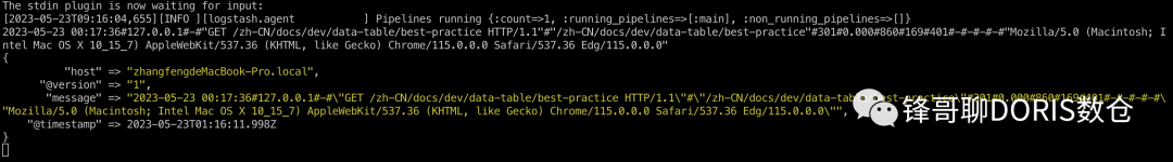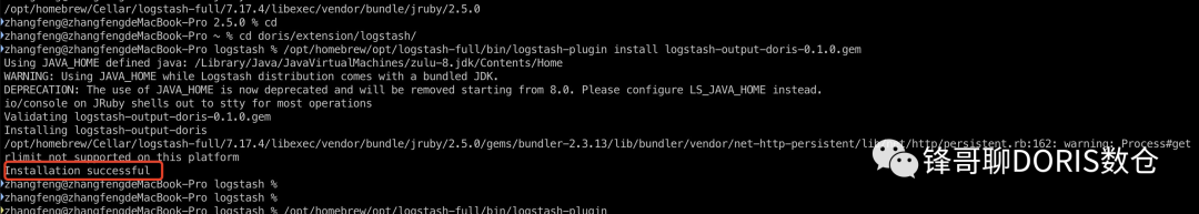 opt/homebrew/opt/filebeat/bin/filebeat -e -c opt/homebrew/etc/filebeat/filebeat.yml logstash-output-doris-{version}.gem安装成功之后可以看到提示信息:
