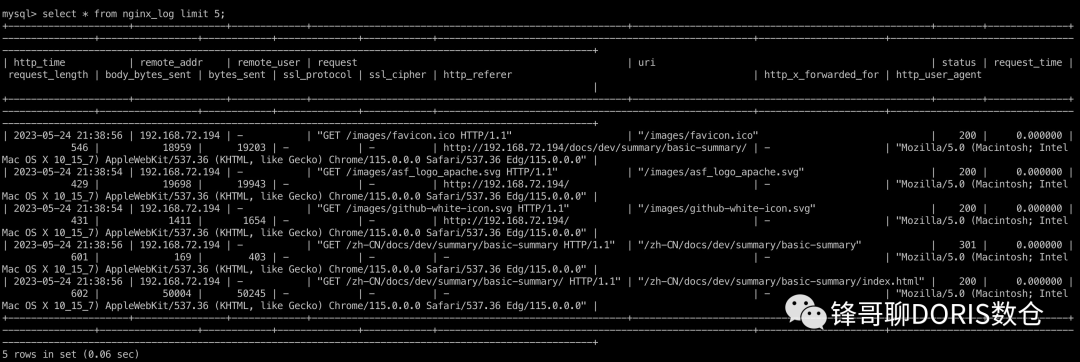 下面这个是我这个例子的创建和Nginx日志格式相对应的表结构,建表语句如下: