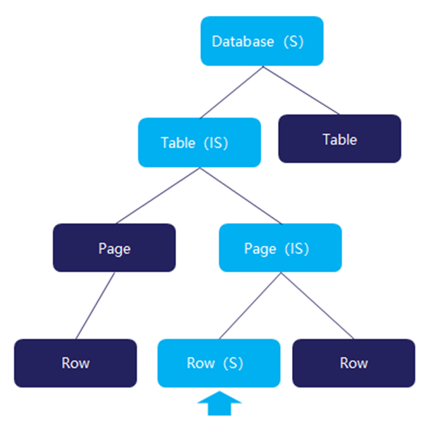 当我们通过索引查询某一行数据的时候,该行数据将分配共享锁(S)。而行所在的页级和表级将分配意向共享锁(IS),表明其更小粒度存在共享锁,能快速检测锁冲突,如行级别共享锁(如下图)。意向更新锁(IU)与意向排他锁(IX)的形成原理也类似。