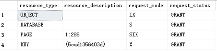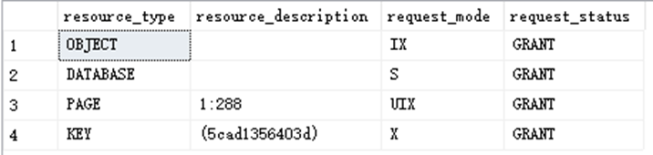 BEGIN TRAN--页面级设置共享锁(S)SELECT * FROM TAB WITH(PAGLOCK,HOLDLOCK) WHERE id = 98--同一个连接,使页面再加上意向排他锁(IX)UPDATE tab SET name = 'Test' WHERE id = 98--查看锁请求情况SELECT resource_type,resource_description,request_mode,request_statusFROM sys.dm_tran_locksWHERE resource_database_id=DB_ID()AND request_session_id=@@SPIDORDER BY request_mode,resource_typeROLLBACK TRAN