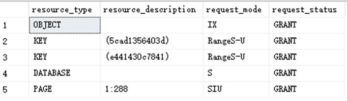 BEGIN TRAN--页面级设置意向更新锁IUSELECT * FROM TAB WITH(UPDLOCK,HOLDLOCK) WHERE id = 98--同一个连接,使页面级加上共享锁(S)SELECT * FROM TAB WITH(PAGLOCK,HOLDLOCK) WHERE id = 98--查看锁请求情况SELECT resource_type,resource_description,request_mode,request_statusFROM sys.dm_tran_locksWHERE resource_database_id=DB_ID()AND request_session_id=@@SPIDORDER BY request_mode,resource_typeROLLBACK TRAN