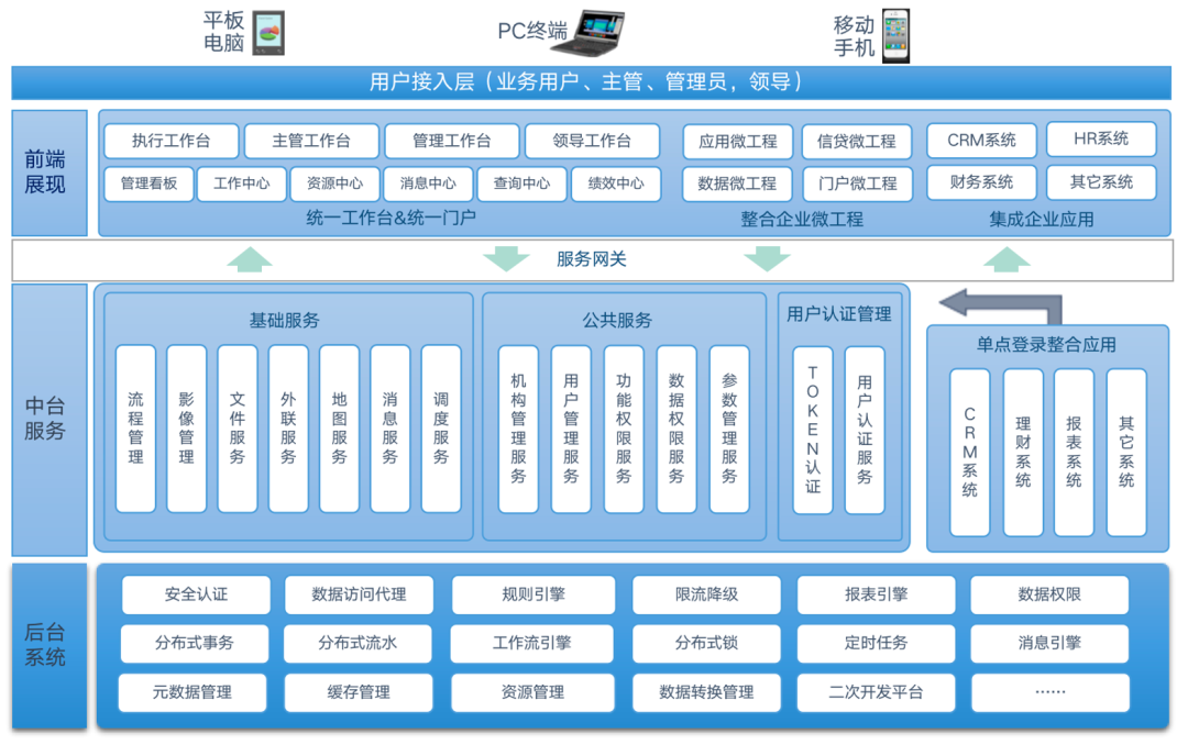 · 统一标准:建立了一套统一的技术和管理规范,并提供一套完整的技术组件,覆盖应用的前中后台开发,实现高性能、稳定、可靠的开发和运行支撑环境。