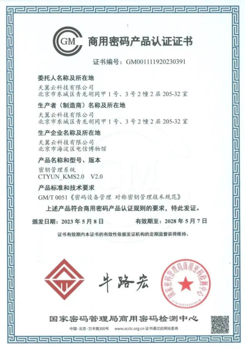 近日,天翼云自研密钥管理系统(KMS)通过国家密码管理局安全性审查,符合GM/T 0051《密码设备管理 对称密钥管理技术规范》要求,获得由国家密码管理局商用密码检测中心颁发的《商用密码产品认证证书》。