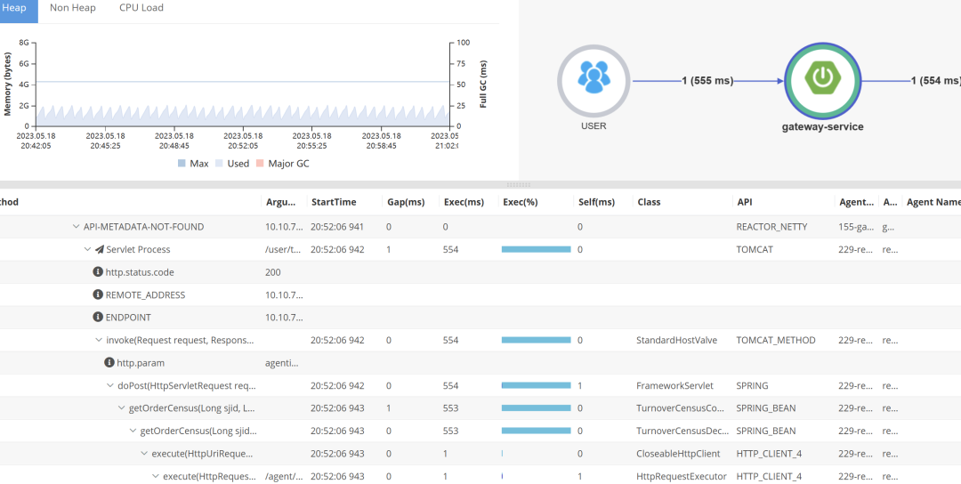 看图可以直观的查看整个请求链路,包括方法名、参数值、请求耗时、返回状态等信息,能快速定位哪个环节出问题了,或者请求时间太长。