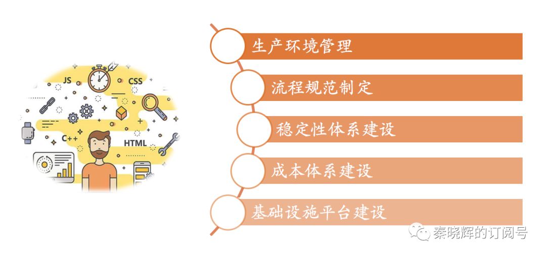 从上文可以看出,运维团队要能管理线上生产环境,要能建设稳定性、成本体系,过程中要能建立平台提升人效,所以总结起来,是如下五点: