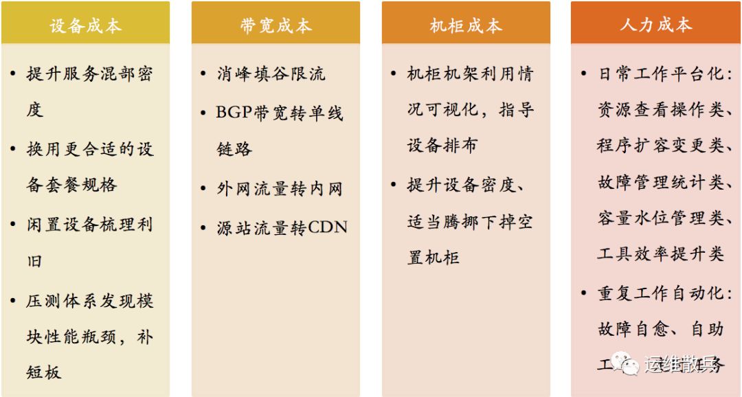 成本体系主要分五个方面:设备成本、带宽成本、机柜成本、人力成本、电力成本,电力成本这个主要跟IDC建设相关,非运维人员关注的重点,其实机柜这个也是主要由系统部操心,业务运维会关注少一些,直接放一张之前总结的PPT: