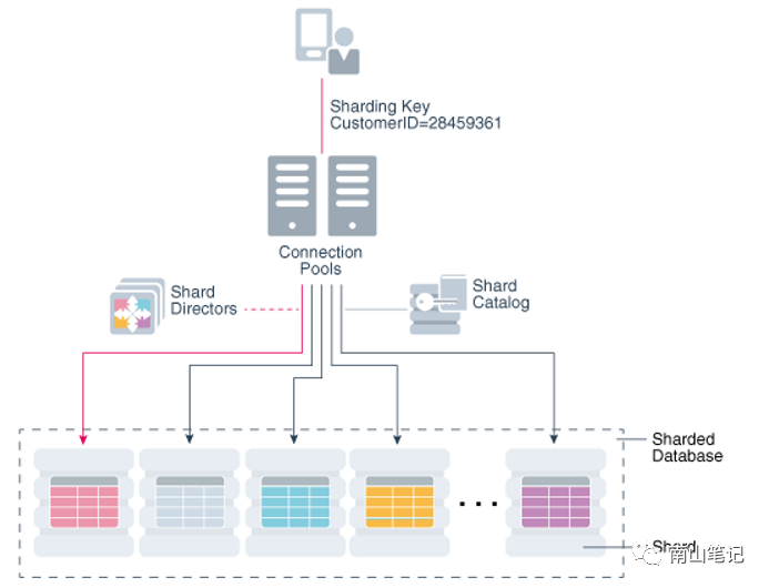 3、Shard catalog,也是一个Oracle数据库,用于集中存储管理SDB配置信息,是SDB的核心。SDB配置变化,比如添加/删除shard,Global service等等,都记录在Shard catalog。查询需要访问多个shard中的数据,则该查询由Shard catalog统一协调分配。