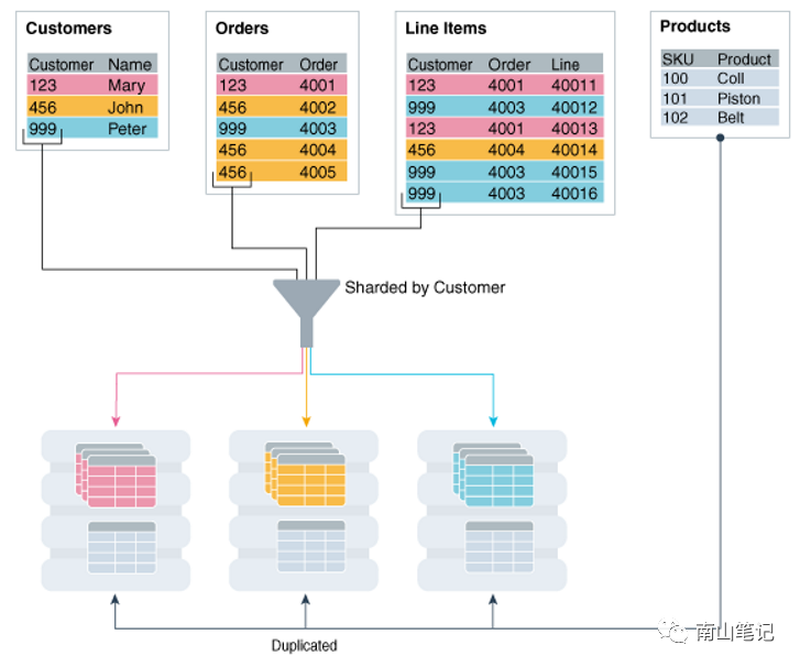 以下是Shared table的示意,该部署方案分布包括3个数据库节点: