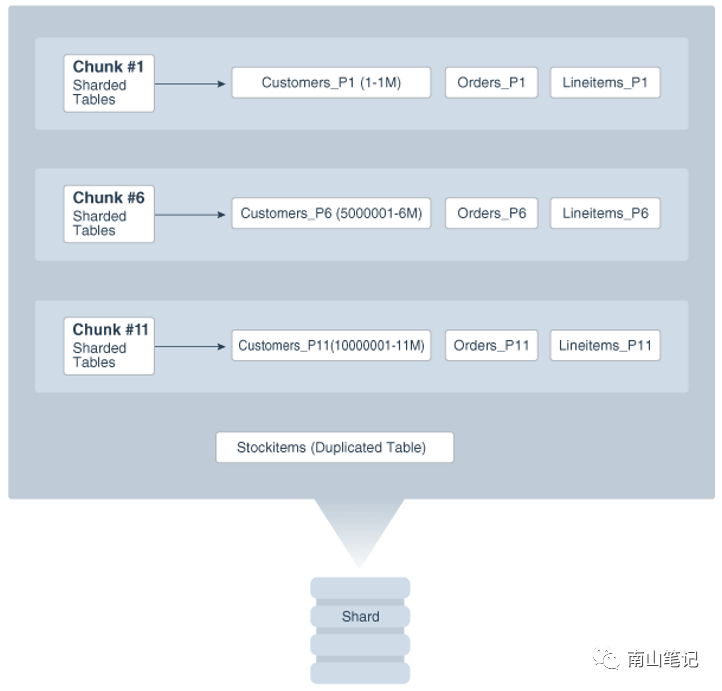 Oracle Sharding在执行CREATE SHARDED TABLE语句时自动将分区分布到shard中,分区的分布对应用程序是透明的。下图显示了分片表的逻辑视图及其物理实现: