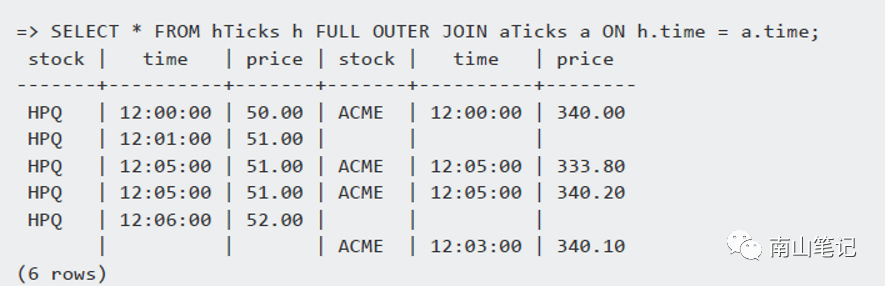 SELECT* FROM hTicks h FULL OUTER JOIN aTicks aON (h.time INTERPOLATE PREVIOUS VALUEa.time);