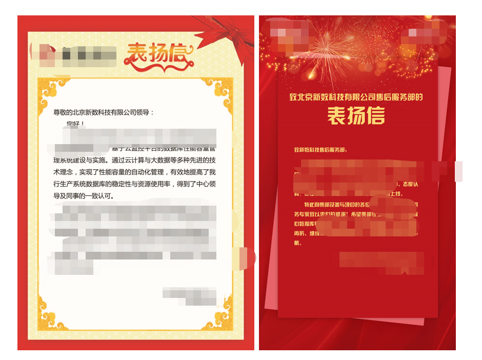 以自主研发技术为核心,新数科技为数百家客户提供安全可信的数据库云产品,其中在金融、政府、能源、制造等领域落地了数百信创标杆,并收到众多客户的感谢信。众多客户对新数科技在合作中体现的高度专业性、过硬的技术实力、耐心的服务态度表示深深的钦佩与感谢。