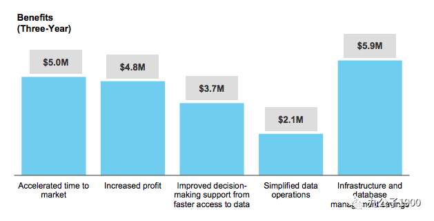 2020年8月Forrester对一些Snowflake使用者(注:样本量不大)的采访数据显示,使用Snowflake云服务的可量化收益分布可以看出,客户最大的收益来自基础设施的成本节约和数据快速响应带来的商业利益。