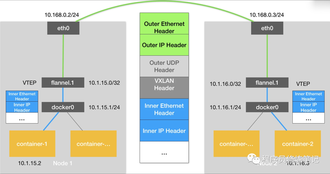 经过所有的封包,完整的二层数据帧封装完毕,经由宿主机的eth0网卡转发至目的宿主机,在目的宿主机上则是上述过程的逆向解封。