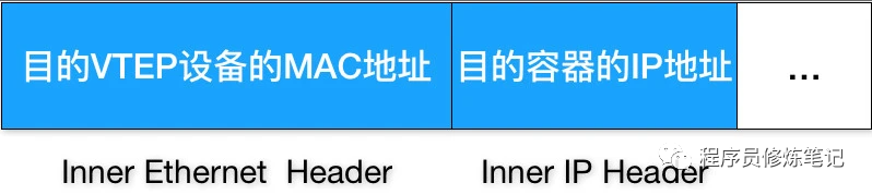 在数据包到达flannel.1设备后,这里会查到目的端的VTEP设备的MAC地址,此时会进行第一次封包工作,在原始数据包上增加一个二层的数据头,如下图:
