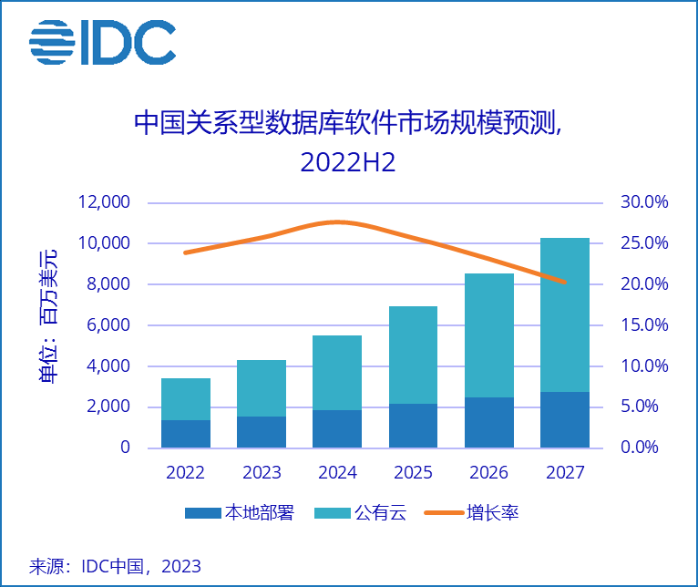 2023年6月5日,IDC 发布的《2022 年下半年中国关系型数据库软件市场跟踪报告》显示:2022年中国关系型数据库软件市场规模为34.3亿美元,同比增长23.9%。其中,公有云关系型数据库规模20.8亿美元,同比增长34.8%;本地部署关系型数据库规模14.6亿美元,同比增长10.3%。