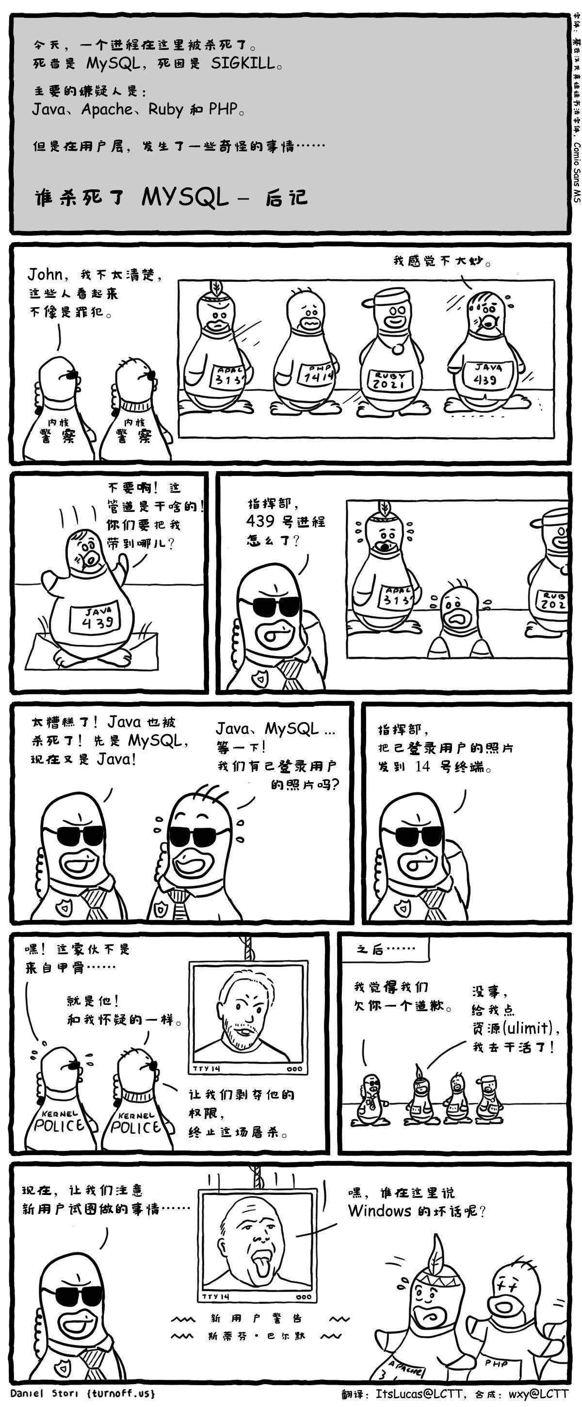 这篇漫画意在讽刺 Oracle 收购太阳微系统公司之后,对收购来的资产一个个杀死,比如 MySQL,导致大多数发行版已经不使用 MySQL ,转向它的分支 MariaDB,在此之后,Oracle 还放弃了“不赚钱的” Java EE。