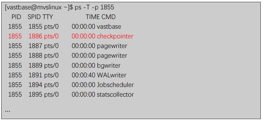使用strace跟踪Vastbase时需要指定参数-f或-ff,实践中我们推荐-ff将每个线程的trace单独生成一个文件。为了方便将跟踪文件和Vastbase线程对应起来,可以提前使用top -Hu或ps -T命令获得线程列表。下面是使用ps -T的一个例子: