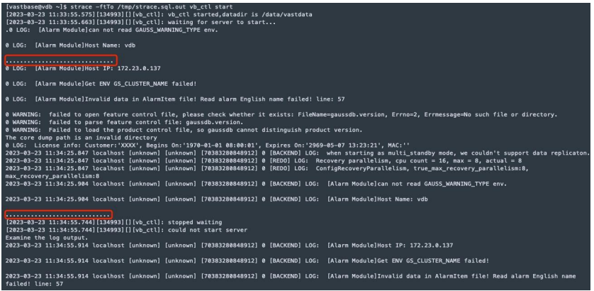 客户上传strace.sql.out和屏幕输出后,我们首先通过屏幕输出确认了问题: