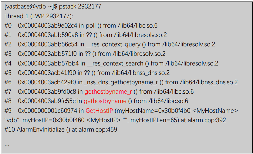 gethostbyname()返回对应于给定主机名的包含主机名字和地址信息的hostent结构的指针。Vastbase继承了openGauss alert模块,数据库启动阶段需要获取hostname和IP,也就是需要做DNS解析。由于客户在问题发生之前调整了网络,DNS解析出现异常,从而导致问题发生。