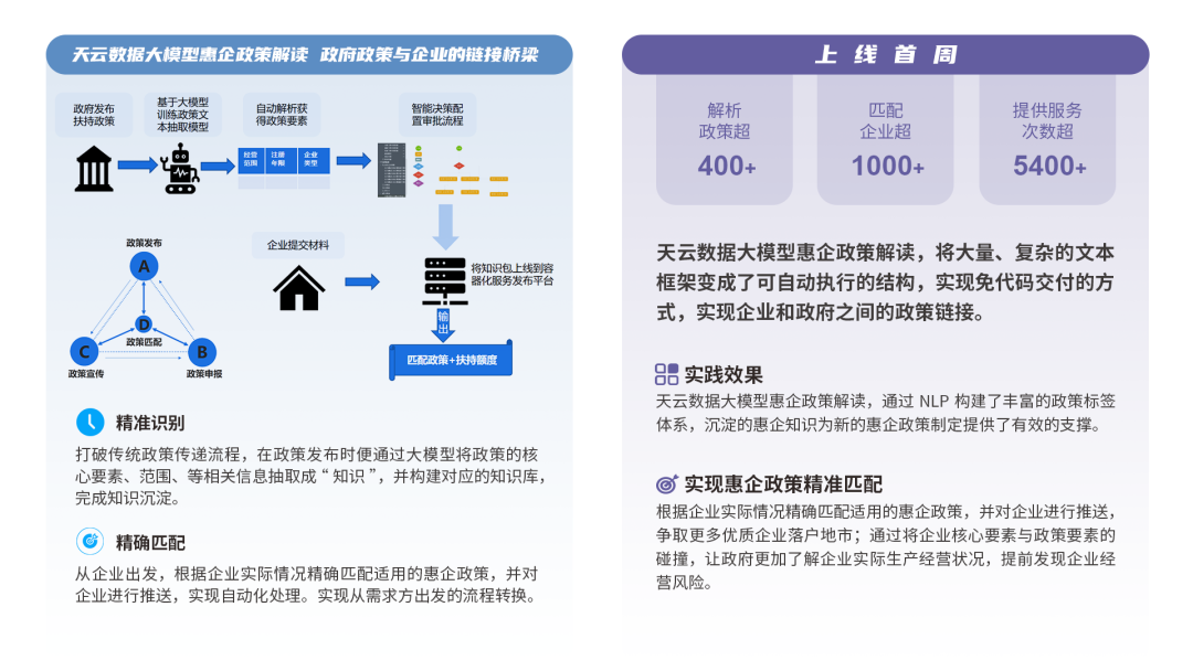 以某大型股份制商业银行要整理400+万篇科技文献为例,这些科技文献中的知识如何指导生产操作,让文献可计算相关操作工艺?天云数据大模型惠企政策解读系统,从惠企政策中自动化识别抽取政策申请相关信息,与企业信息进行精准匹配,实现政府政策与企业的链接桥梁,做到精准识别、精准匹配。在实践中,上线首周解析政策超400+,匹配企业超1000+,提供服务次数超5400+。