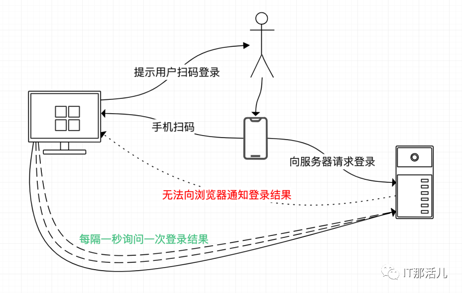 来看一个实际场景,我们经常碰到扫码登录的情况,浏览器展示一个二维码,提示通过手机扫码登录,用户通过手机扫码,向服务器发送登录请求。在这个过程中,浏览器每隔一段时间询问服务器登录结果。这种方式只能是客户端向服务器发出请求,服务器返回查询结果,HTTP协议做不到服务器主动向客户端推送信息。