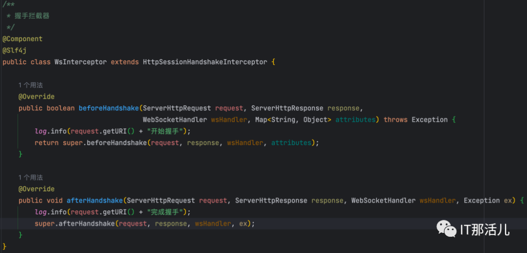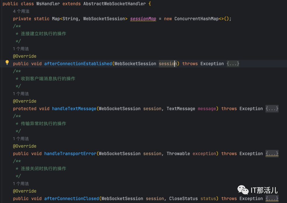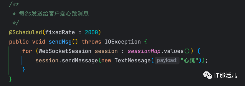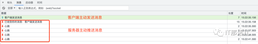 接下来以基于常见的Spring方式实现一个后端向前端发送心跳的WebSocket例子。客户端主要通过let ws = new WebSocket(url) 这个API来创建WebSocket对象,其中参数url格式为:ws://ip地址:端口/资源名称。该对象包括4个处理事件,onopen事件用于连接建立时触发,onmessage事件用于接收到服务端消息时触发,onerror事件用于发生错误时触发,onclose事件用于连接关闭时触发,还有一个send方法用于向后端发送数据。实现握手拦截器,用于在请求握手前后添加自定义操作。新建自定义拦截器,继承HttpSessionHandshakeInterceptor抽象类,选择实现其中的beforeHandshake和afterHandshake方法来分别在握手前和握手后添加处理逻辑。实现WebSocket处理程序,用于添加连接前、连接中、连接后的处理逻辑。新建自定义处理类,继承AbstractWebSocketHandler抽象类,类似于前端的4个处理事件,此处也需要实现4个处理方法分别用于在建立连接、收到客户端消息、传输异常、连接关闭情况下添加处理逻辑。在上述处理程序中添加一个定时向浏览器发送心跳的方法,可以看到WebSocket向客户端发送消息主要是通过WebSocketSession的sendMessage方法实现的。实现WebSocket配置程序。新建WsConfig配置类实现WebSocketConfigurer接口,该接口只有一个registerWebSocketHandlers注册方法,将上述自定义握手拦截器、处理程序注册到WebSocketHandlerRegistry中并指定访问资源名称。运行程序,测试该WebSocket连接,可见能成功接收到服务端主动推送过来的心跳消息。总 结: