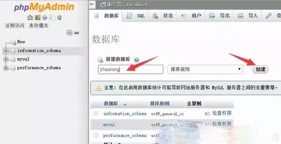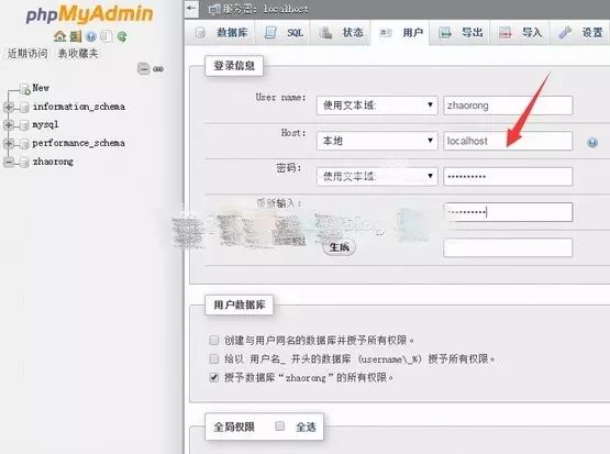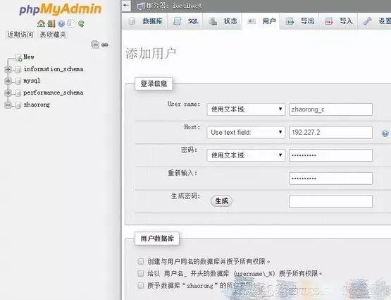 如上图,我添加了一个名为zhaorong的数据库。然后添加用户,我也设定用户名为zhaorong,并赋予他对数据库zhaorong的全部权限。