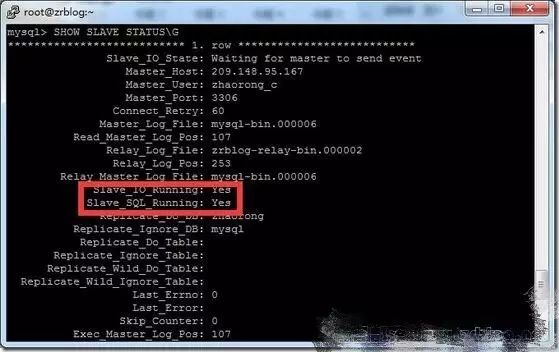 mysql>change master to master_host=’209.148.95.*’,master_user=’zhaorong_c’,master_password=’***’,master_log_file=’mysql-bin.000006′ ,master_log_pos=107; #这一行比较长,注意那个mysql-bin.000006和107就是之前记录下来的