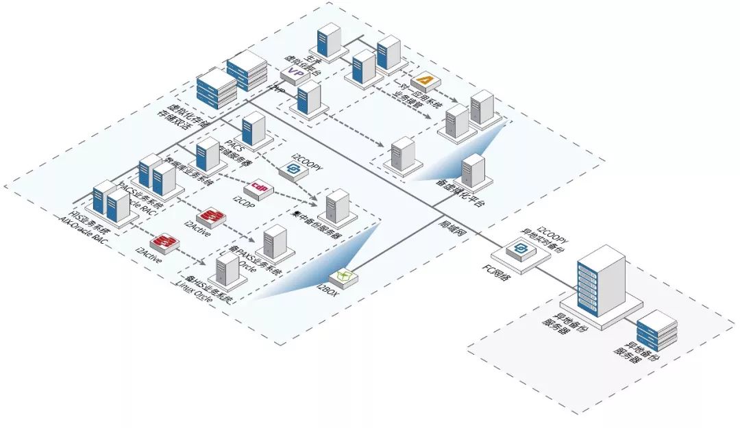1)医院核心的HIS和PACS系统运行在AIX的Oracle RAC环境,通过英方i2Active做实时灾备。