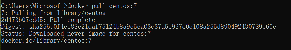 在windows环境下进行构建,我们打开windows的cmd窗口,拉取centos7的基础镜像。