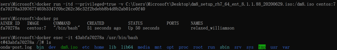 docker run -itd --privileged=true -vC:\Users\Microsoft\Desktop\dm8_setup_rh7_64_ent_8.1.1.88_20200629.iso:/dm8.iso centos:7