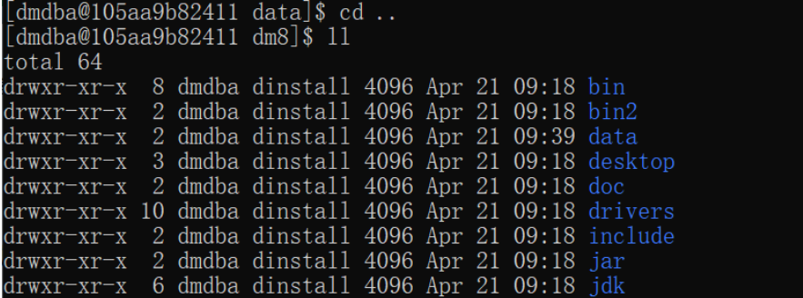 进入/dm8目录可以看到数据库软件已经装好了,无需再进行安装,只用创建数据库实例就可以使用数据库。