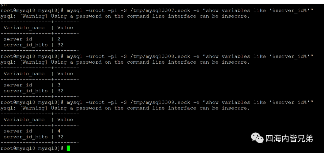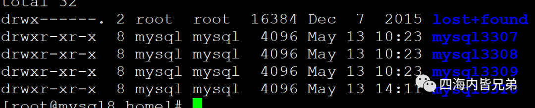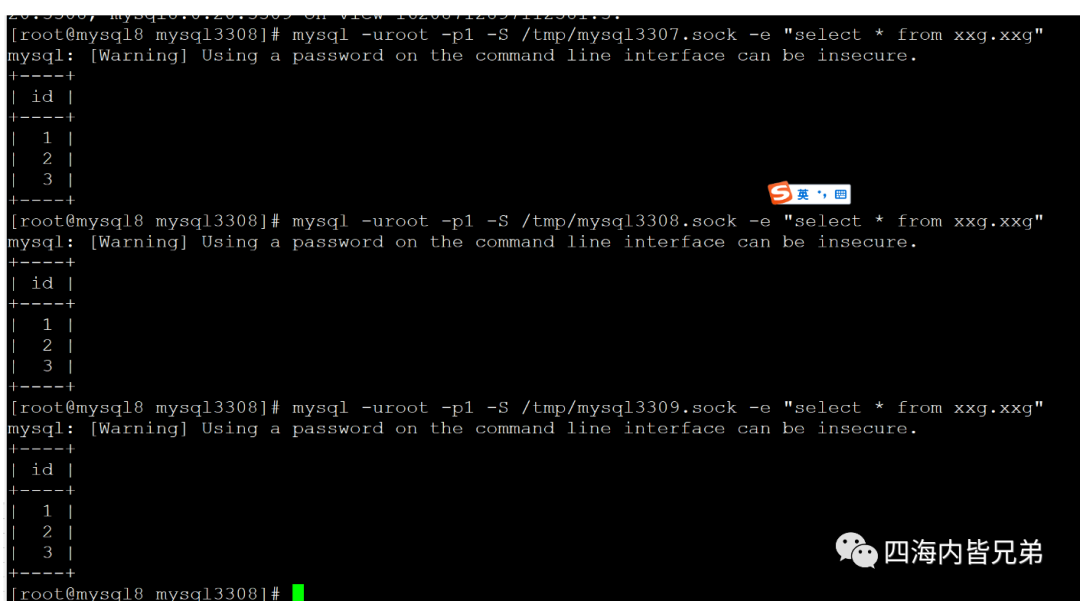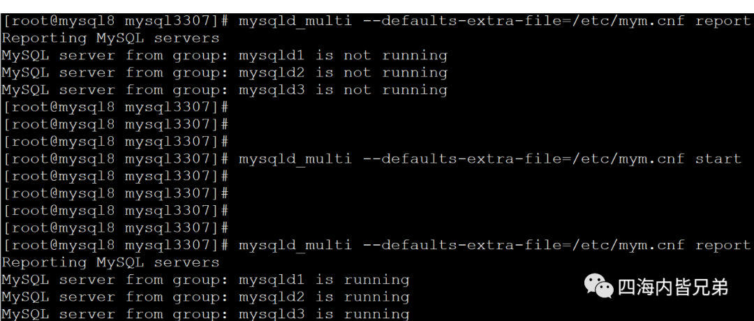 首先建立3个数据库。由于仅仅是为了验证功能效果,在一台机器上操作这些会方便一点。我们在一个机器上开3个实例。3307是基准库 3308 和3309是空的。这两个空的主要是为了克隆。