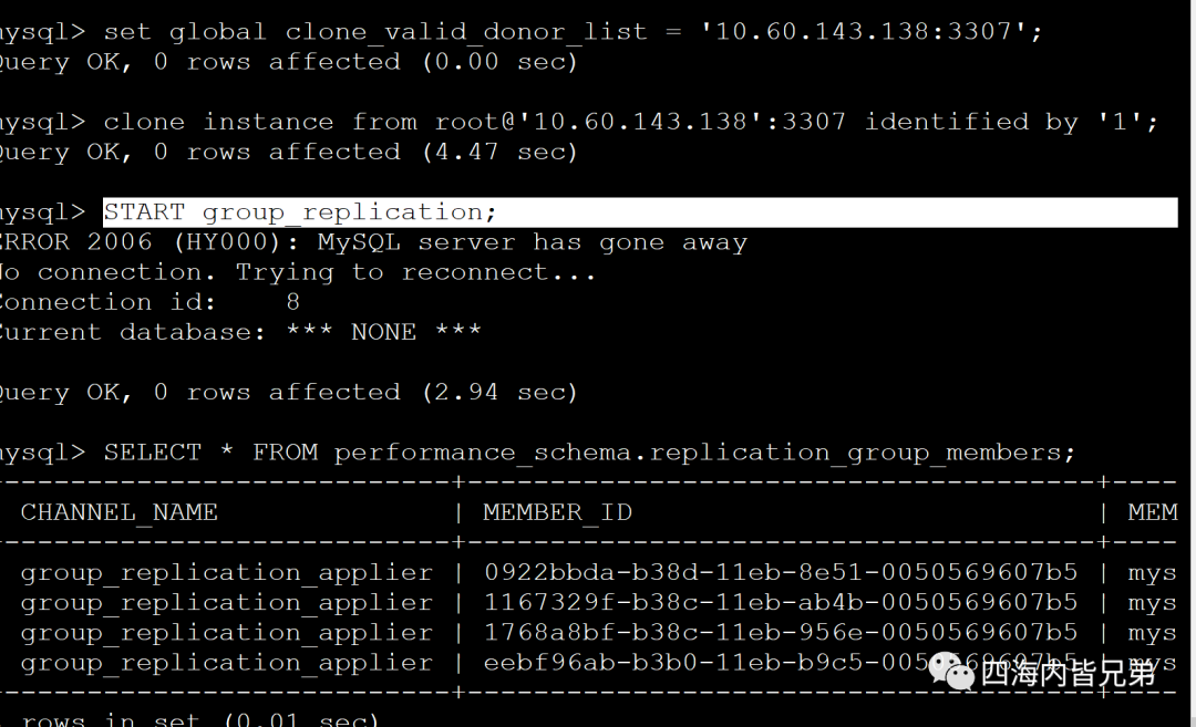 MGR这个已经出来好几年了。是5.7中后期推出的。对此我已经轻车熟路,5min足以搞好一套。现在大家都陆续使用8版本了,我在8中用以前轻车熟路的脚本搭建一次,发现根本搭不起来了。