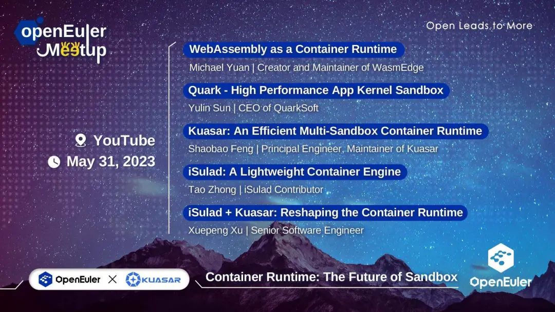 5月底,由openEuler 与 Kuasar 联合发起的技术讨论会—openEuler Container Runtime Meetup在线上举行。本次活动邀请到WasmEdge创始人Michael Yuan,QuarkSoft CEO Yulin Sun,以及openEuler iSulad和Kuasar项目专家和开发者,探讨openEuler iSulad和Kuasar在云原生领域最新进展与创新应用。