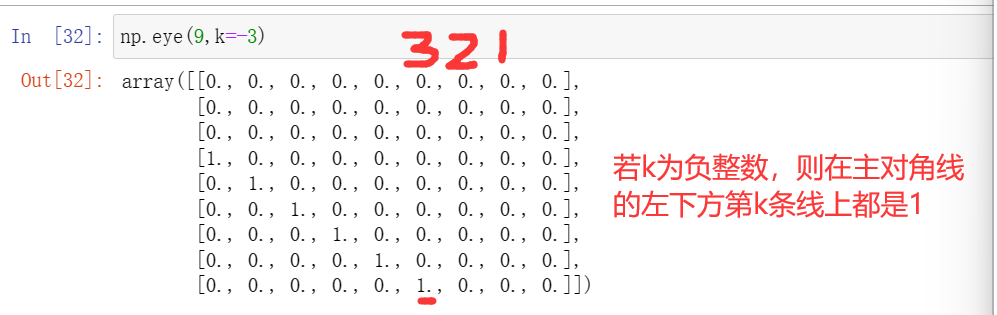 np.eye(9,k=-3)跟它类似的还有np.diag():