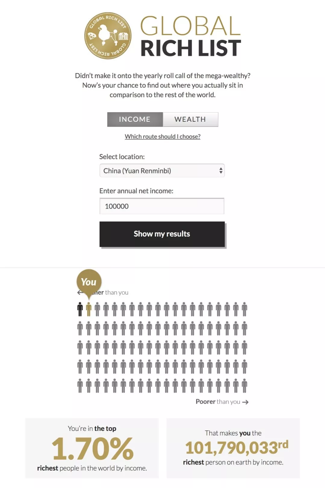 安利给大家一个有趣的网站叫globalrichlist,输入你的国家和年可支配收入,你就可以清晰知道自己的财富水平在世界的排名了。