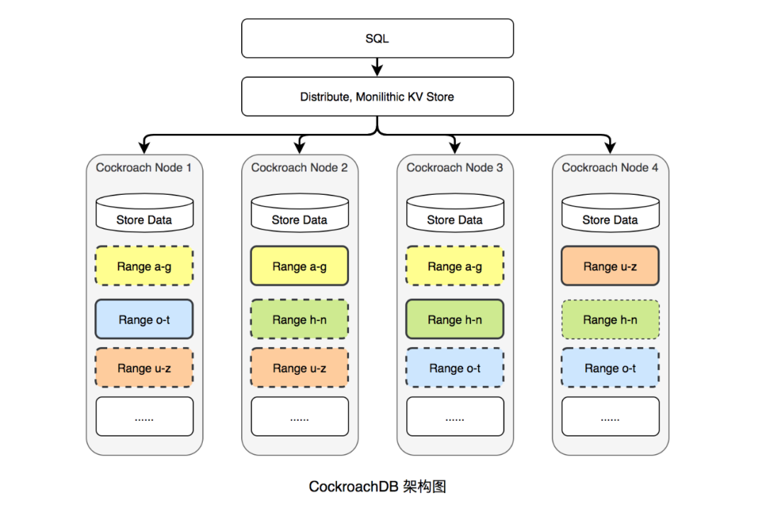 这里将以 CockroachDB 为例来探讨分布式数据库的水平扩展过程。CockroachDB 是一个参考Google Spanner[10]论文的实现的开源的 NewSQL 数据库。一个 CockroachDB 集群是由多个 Cockroach Node 组成,每个Cockroach Node 会同时负责SQL执行与数据存储。CockroachDB 底层的存储引擎 RocksDB 会将数据组织成有序的 Key-Value 对形成一个KV map。